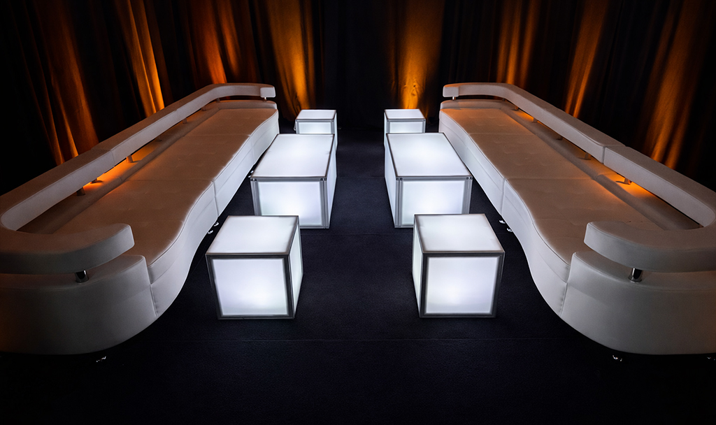 2 Tufted High Back Corner Chairs 2 Tufted High Back Chairs 2 Tufted Circle Ottomans 1 Led Coffee Table 2 Led Cubes